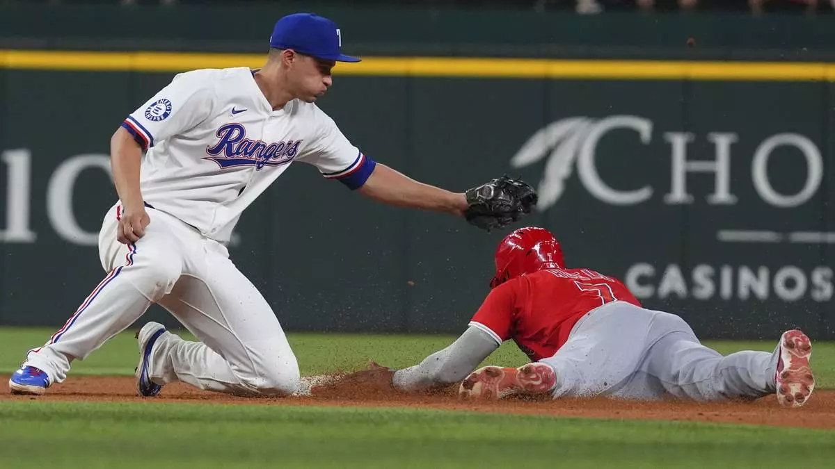 Los Angeles Angels' Jo Adell (7) steals second base against Texas Rangers shortstop Corey Seager during the eighth inning of a baseball game, Monday, Aug. 25, 2025, in Arlington, Texas. (AP Photo/LM Otero)