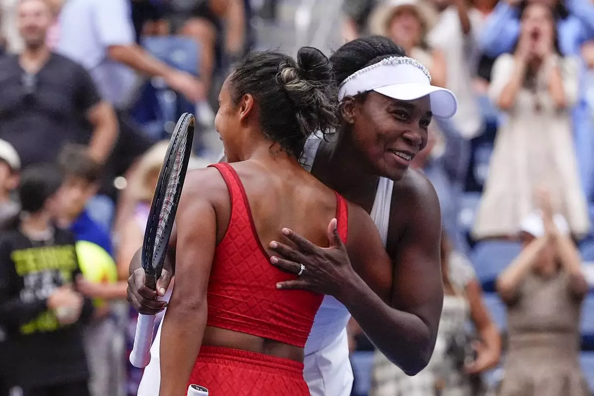 Venus Williams, of the United States, right, and Leylah Fernandez, of Canada, hug after defeating Lyudmyla Kichenok, of the Czech Republic and Ellen Perez, of Australia, in a first round women's doubles match during the U.S. Open tennis championships, Thursday, Aug. 28, 2025, in New York. (AP Photo/Yuki Iwamura)