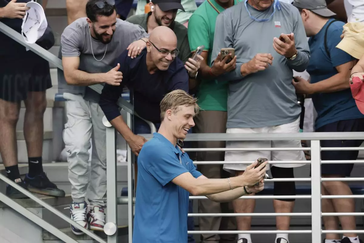 Denis Shapovalov, of Canada, poses for a photo with fans after defeating Valentin Royer, of France, during the second round of the U.S. Open tennis championships, Thursday, Aug. 28, 2025, in New York. (AP Photo/Adam Hunger)