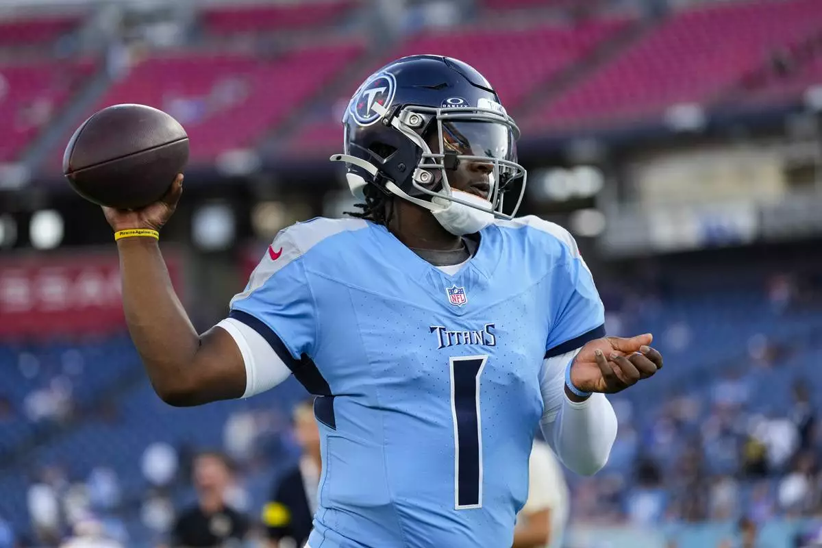 Tennessee Titans quarterback Cam Ward (1) throws before a preseason NFL football game against the Minnesota Vikings, Friday, Aug. 22, 2025, in Nashville, Tenn. (AP Photo/George Walker IV)