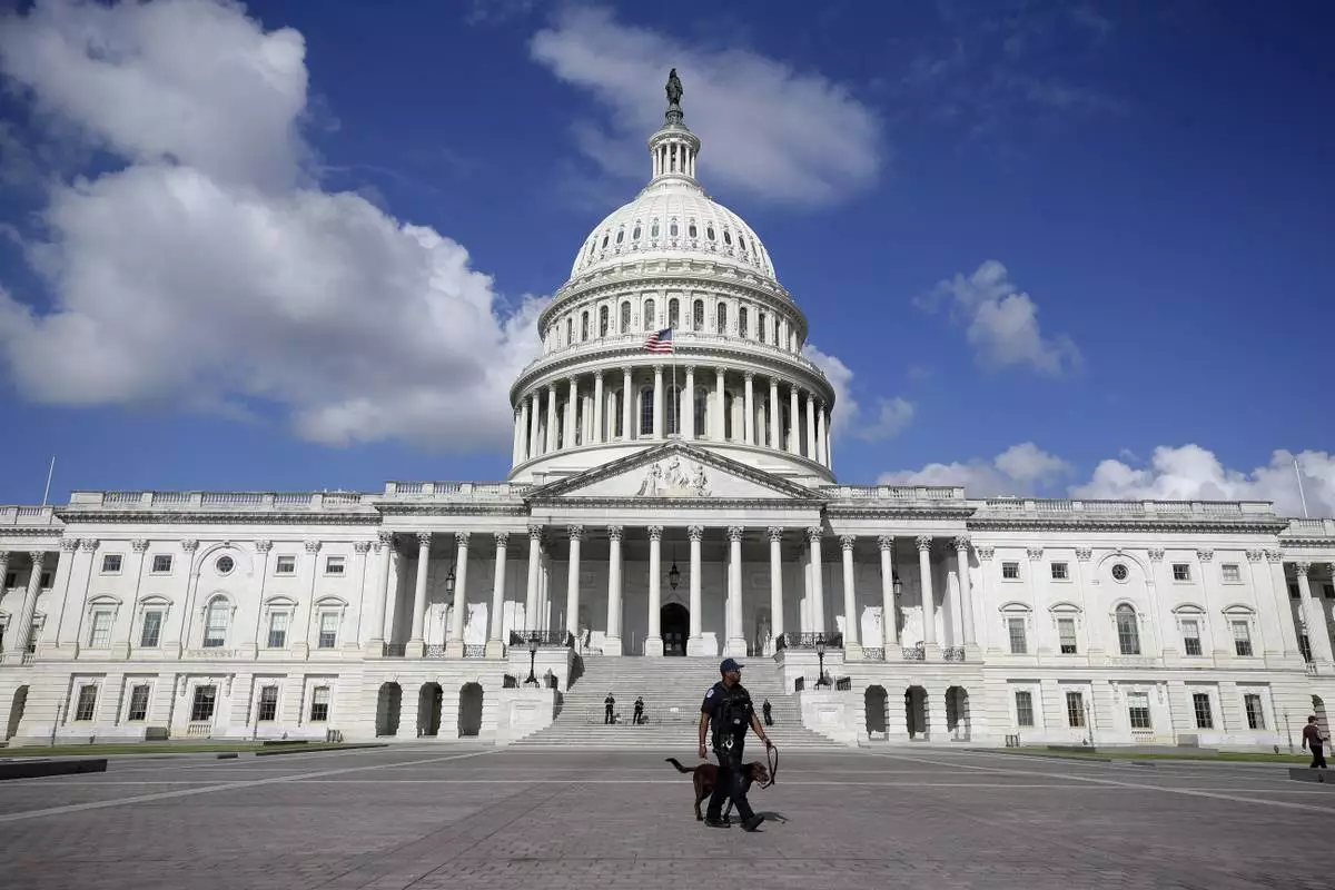 A U.S. Capitol Police officer walks in front of the U.S. Capitol, Friday, Aug. 22, 2025, in Washington. (AP Photo/Rahmat Gul)