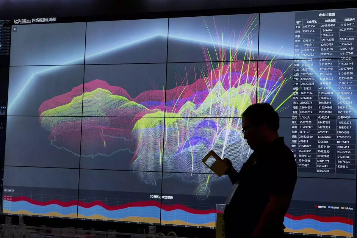 FILE - A worker using his phone is silhouetted against a computer display showing a live visualization of the online activities across China during the 4th China Internet Security Conference (ISC) in Beijing, Aug. 16, 2016. (AP Photo/Ng Han Guan, File)