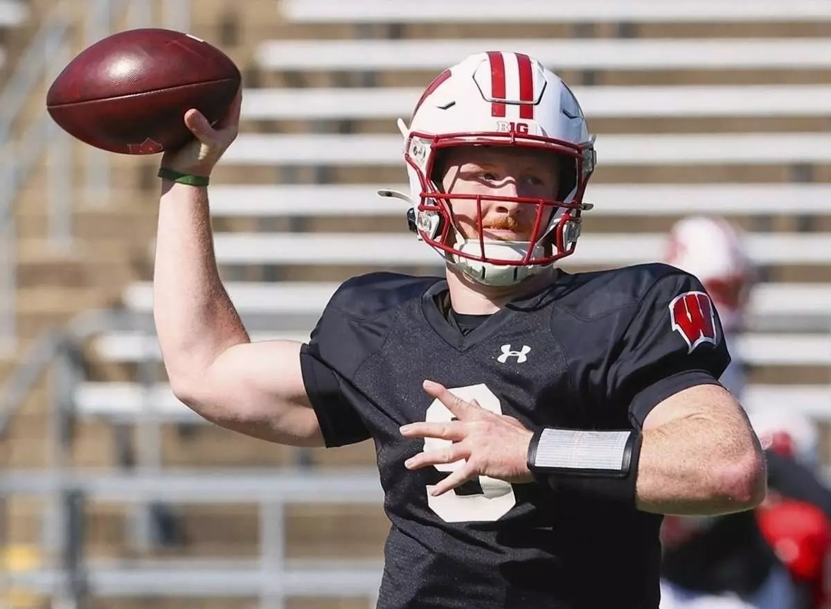 FILE - Billy Edwards Jr. throws a pass at a Wisconsin spring football practice Saturday, April 5, 2025, in Madison, Wis. (Owen Ziliak/Wisconsin State Journal via AP, File)