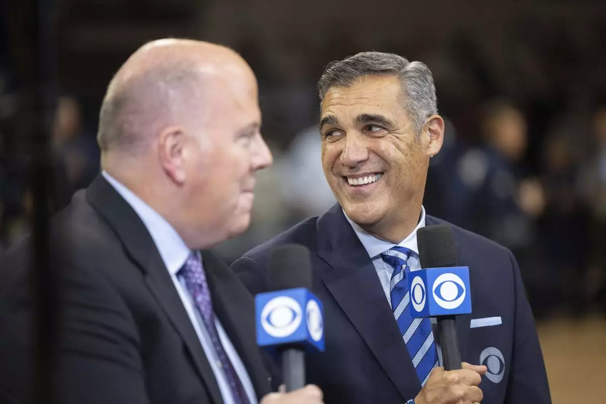 FILE - Former Villanova coach Jay Wright, right, who now works for CBS, stands with colleague Tom McCarthy, before an NCAA college basketball game between Villanova and Penn, Dec. 7, 2022, in Villanova, Pa. (AP Photo/Laurence Kesterson, File)
