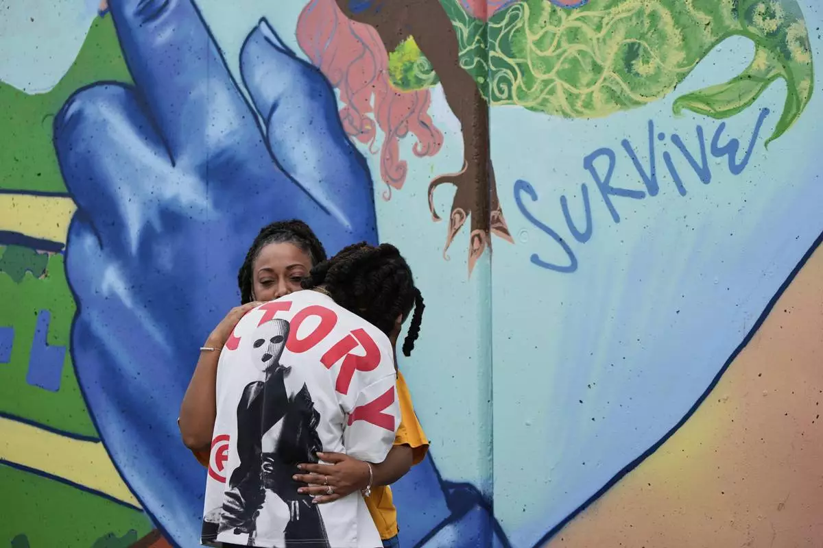 Jasminne Navarre hugs Constance Osum, left, during a wreath laying event to commemorate the 20th anniversary of Hurricane Katrina, at the Hurricane Katrina Memorial in Charity Hospital Cemetery in New Orleans, Friday, Aug. 29, 2025. (AP Photo/Gerald Herbert)