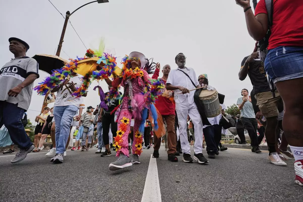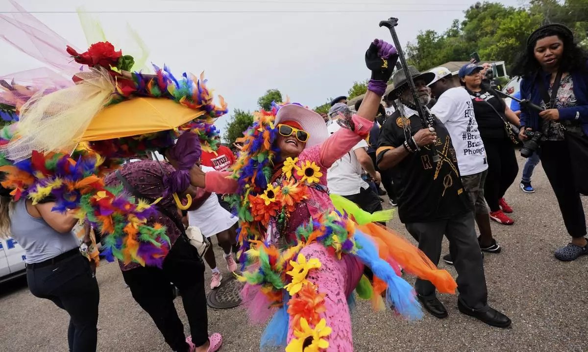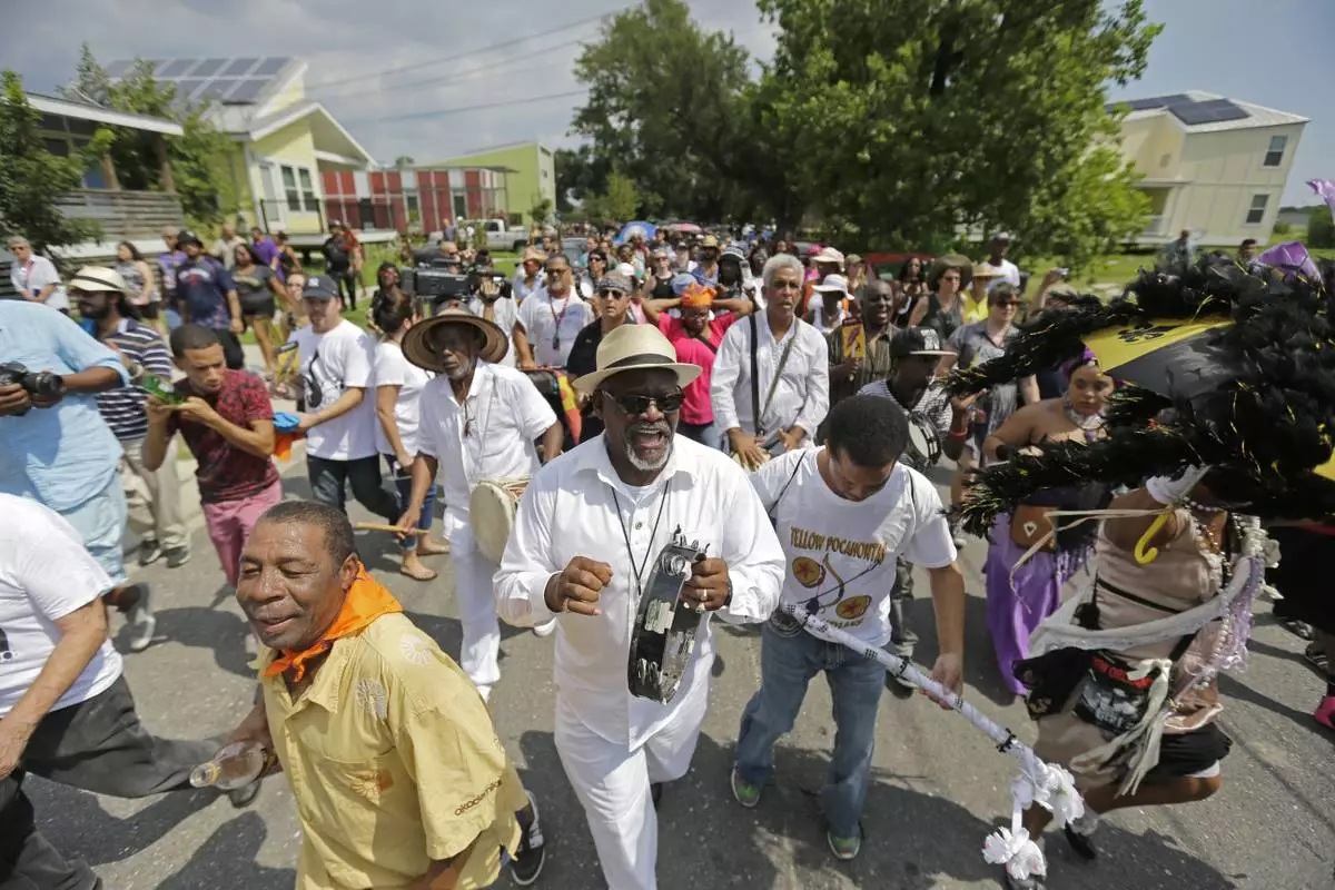 Second line parades have been a staple of Katrina anniversaries since 2006. On Friday, people on bikes and stilts moved among dancers in bedazzled outfits marching to the snap of snare drums and the brassy thump of tubas.