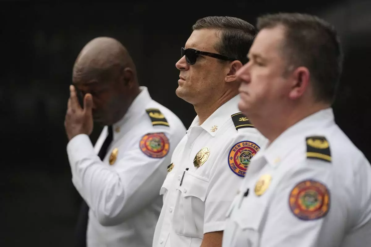 New Orleans fire chiefs Zachary Gremillion, left, Ray Casey, and Byron Casey, right, stand at attention during a wreath laying event to commemorate the 20th anniversary of Hurricane Katrina, at the Hurricane Katrina Memorial in Charity Hospital Cemetery in New Orleans, Friday, Aug. 29, 2025. (AP Photo/Gerald Herbert)