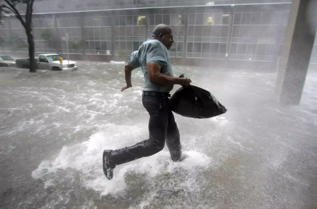 FILE - Arnold James tries to keep his feet as a strong gust nearly blows him over as makes his way on foot to the Louisiana Superdome in New Orleans, Aug. 29, 2005. (AP Photo/Dave Martin, File)
