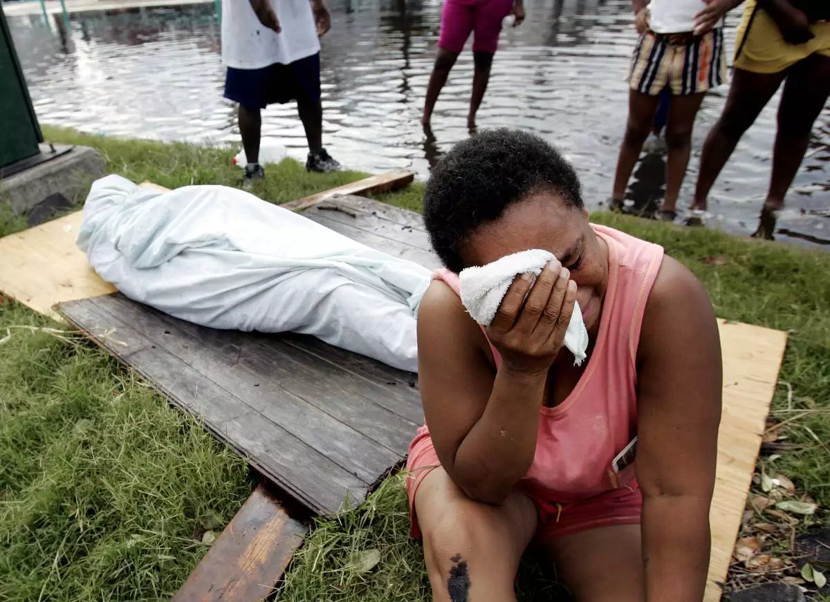 FILE - Evelyn Turner cries alongside the body of her common-law husband, Xavier Bowie, after he died in New Orleans, Aug. 30, 2005. (AP Photo/Eric Gay)