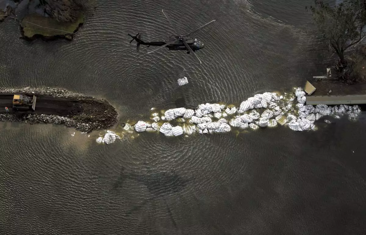 FILE - A military helicopter drops a sandbag as work continues to repair the 17th Street canal levee in New Orleans, Sept. 5, 2005. (AP Photo/David J. Phillip, Pool, File)