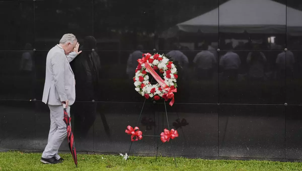 Gary Wainwright pauses at tombs for unidentified victims during a wreath laying event to commemorate the 20th anniversary of Hurricane Katrina, at the Hurricane Katrina Memorial in Charity Hospital Cemetery in New Orleans, Friday, Aug. 29, 2025. (AP Photo/Gerald Herbert)