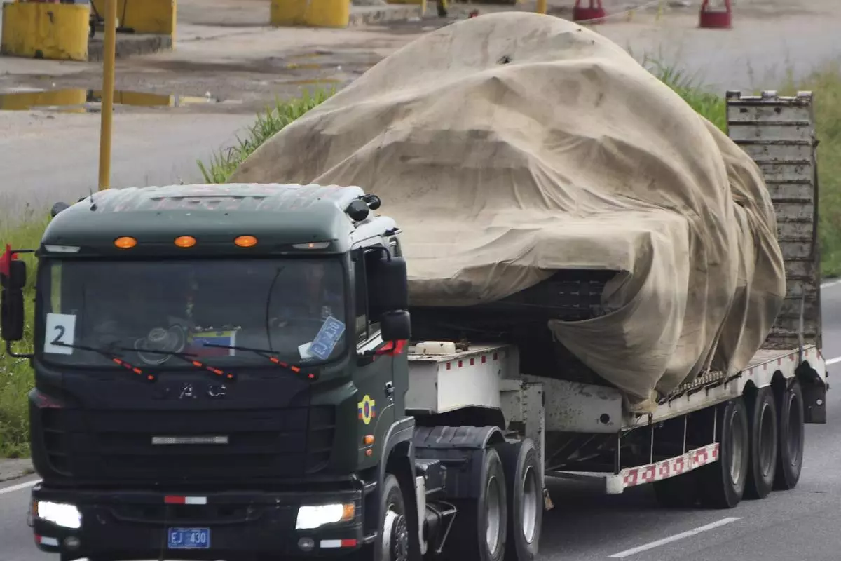 Trucks transport tanks east from Valencia, Venezuela, Wednesday, Aug. 27, 2025, after the government announced a military mobilization following the U.S. deployment of warships off Venezuela. (AP Photo/Jacinto Oliveros)
