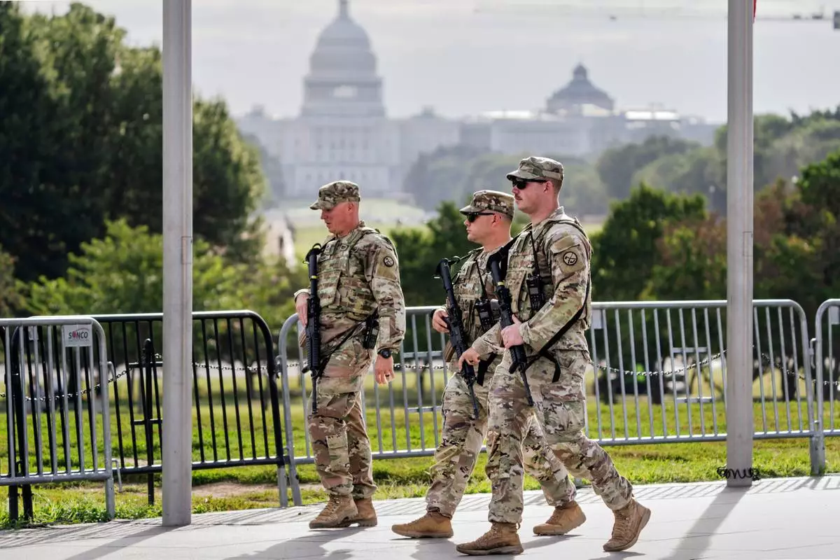National Guard troops patrol the grounds of the Washington Monument with the Capitol seen in the distance as part of President Donald Trump's order to impose federal law enforcement in the nation's capital, in Washington, Thursday, Aug. 28, 2025. (AP Photo/J. Scott Applewhite)