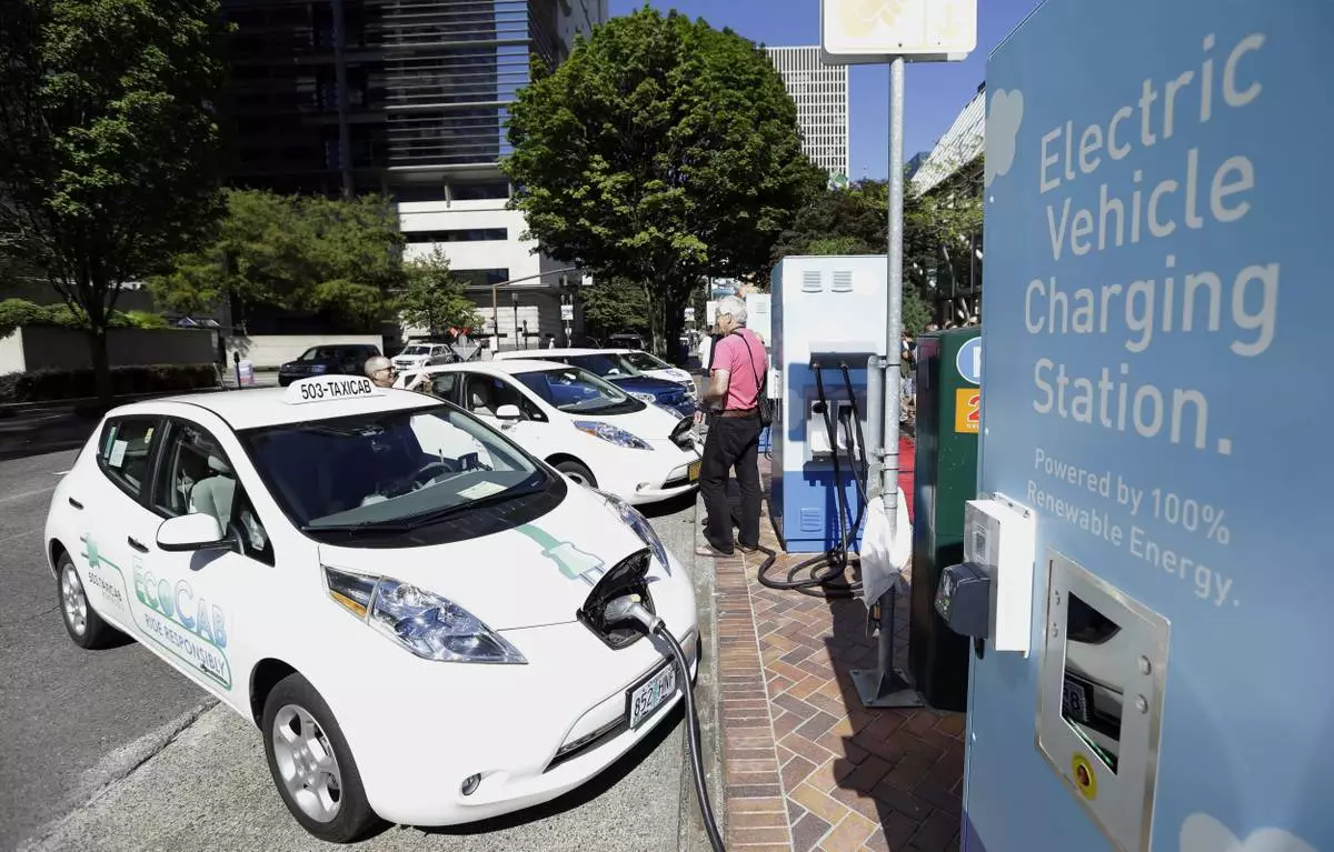FILE - A line of electric cars and newly installed charging stations sit in front of the Portland General Electric headquarters building on July 28, 2015, in Portland, Ore. (AP Photo/Don Ryan, File)