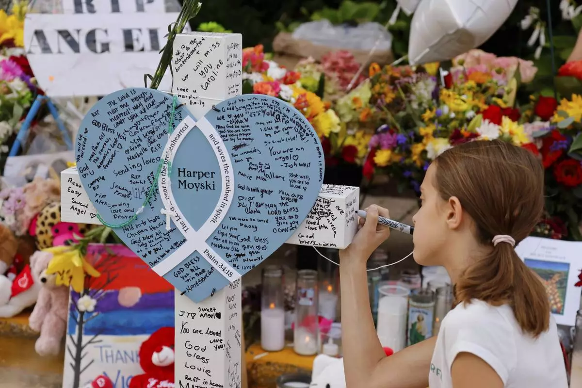 A child writes a message as people visit a make-shift memorial at Annunciation Catholic Church after the Wednesday's shooting at the school, Friday, Aug. 29, 2025, in Minneapolis. (AP Photo/Bruce Kluckhohn)