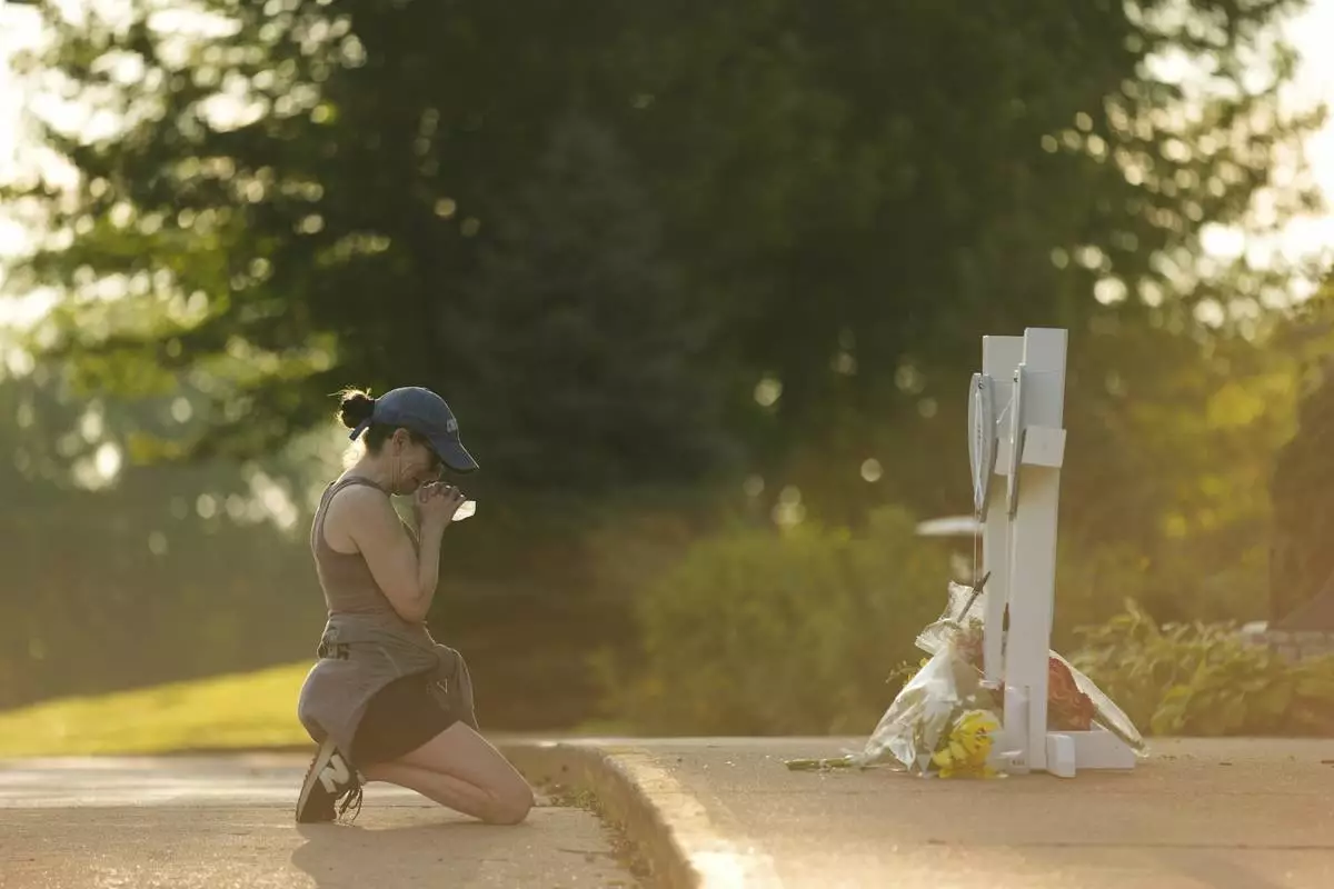 A person prays as she visits at a memorial at Annunciation Catholic Church after Wednesday's school shooting, Thursday, Aug. 28, 2025, in Minneapolis. (AP Photo/Abbie Parr)