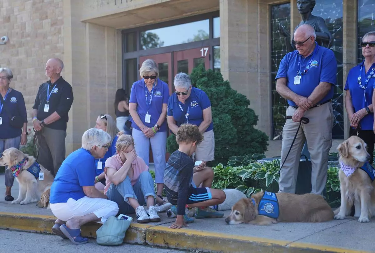 Members of a Lutheran church charities comfort dog ministry sit and stand in front of the Annunciation Catholic Church after Wednesday's school shooting, Thursday, Aug. 28, 2025, in Minneapolis. (AP Photo/Abbie Parr)