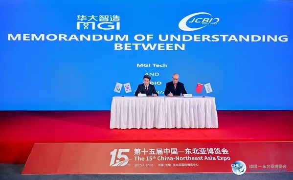 CHANGCHUN, China, Aug. 29, 2025 /PRNewswire/ -- MGI Tech Co., Ltd. ("MGI"), a company dedicated to developing core tools and technologies that drive innovation in life sciences, and JCBio Co., Ltd. ("JCBio"), a leading South Korean biotechnology company, have signed a Memorandum of Understanding (MoU) to launch the DCS Lab Project, a landmark collaboration. The initiative aims to accelerate multi-omics research, novel sequencing applications, precision medicine, clinical translation, and AI-driven data insights in South Korea. By combining MGI's advanced omics technologies with JCBio's local expertise, the partnership empowers researchers and clinicians while strengthening South Korea's role as a regional leader in genomics and biotechnology.
