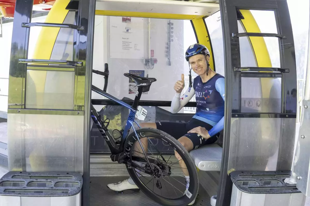 Chris Froome of Israel - Premier Tech takes the Cablecar after finishing the eigth stage, a 10.1 km Mountain time trial from Beckenried to Stockhuette, at the 88th Tour de Suisse UCI World Tour cycling race, Sunday, June 22, 2025. (Urs Flueeler/Keystone via AP)