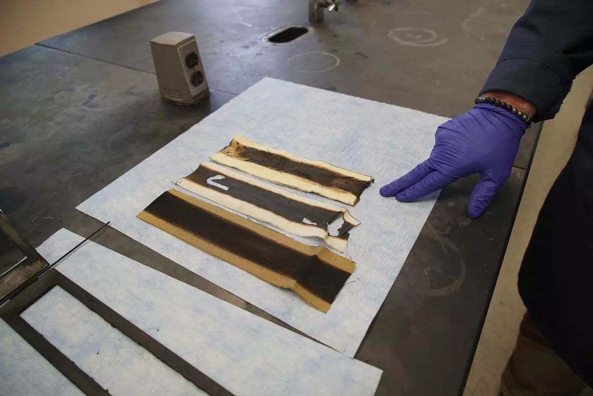 Charred pieces of non-PFAS-treated fabric sit on a lab bench following a burn test at North Carolina State University's Wilson College of Textiles in Raleigh, N.C., Aug. 8, 2025. (AP Photo/Allen G. Breed)