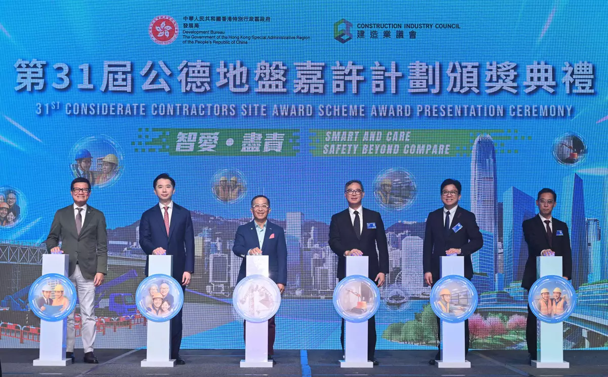The 31st Considerate Contractors Site Award Scheme Award Presentation Ceremony, co-organised by the Development Bureau (DEVB) and the Construction Industry Council (CIC), was held today (August 29) to commend construction contractors, site supervising teams, project leaders, frontline supervisors and workers with outstanding safety performances. Over 400 public and private construction sites participated in the Scheme this year.