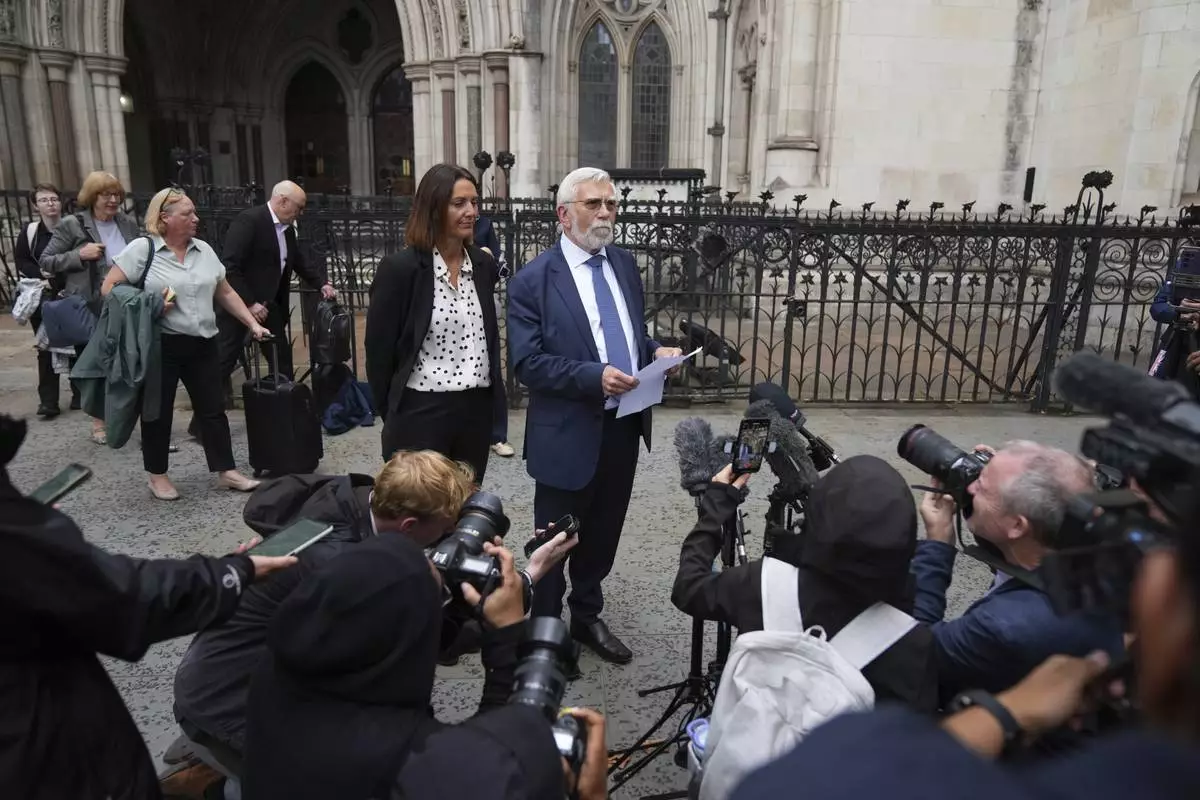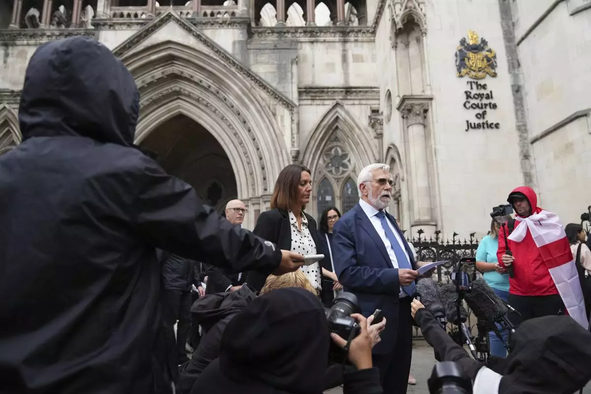 Ken Williamson, Councillor of Epping Forest District Council, front, speaks to press after the judgment due in Home Office and hotel owner's appeal bids against Epping asylum seeker ruling, at The Royal Courts Of Justice in London, Friday, Aug. 29, 2025. (AP Photo/ Joanna Chan)