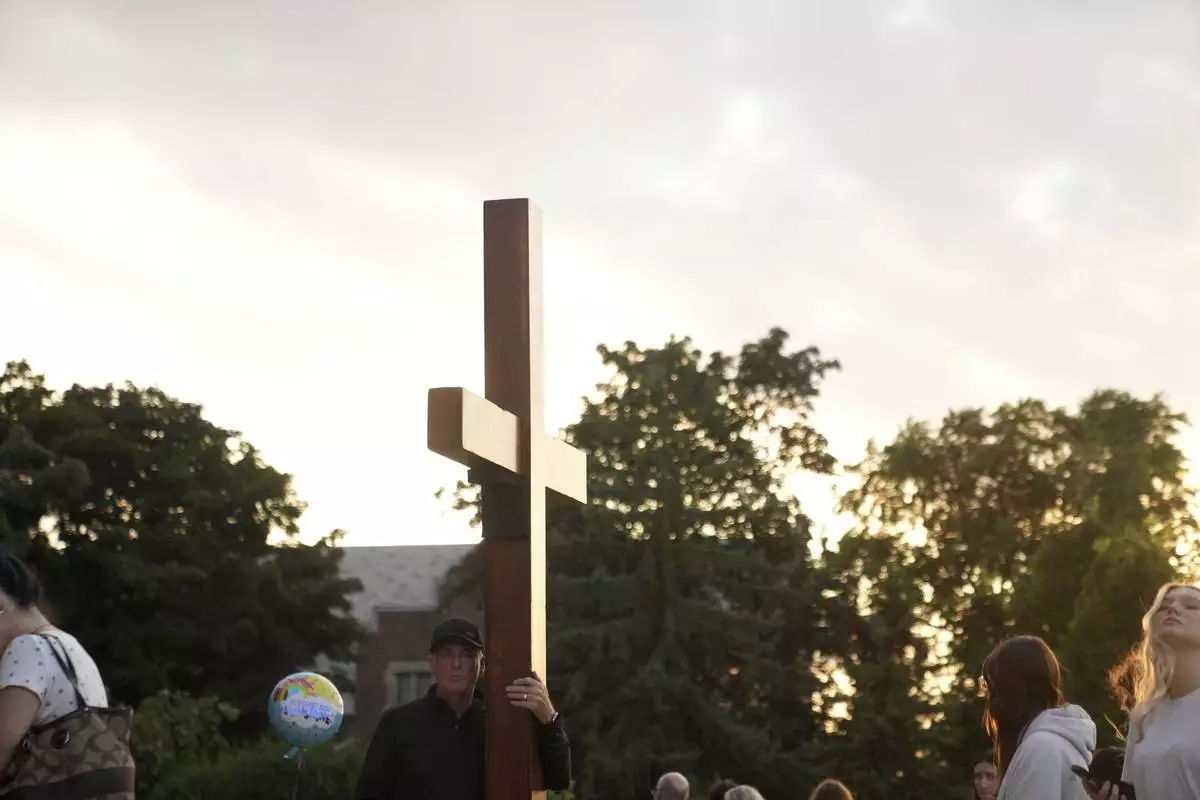 Dan beazley carries a cross at a memorial at Annunciation Catholic Church after Wednesday's school shooting, Thursday, Aug. 28, 2025, in Minneapolis. (AP Photo/Abbie Parr)