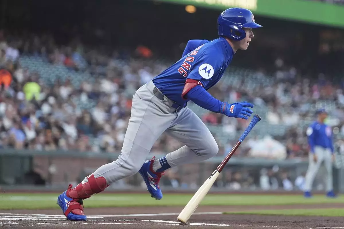 Chicago Cubs' Pete Crow-Armstrong runs to first base after hitting a single against the San Francisco Giants during the first inning of a baseball game in San Francisco, Tuesday, Aug. 26, 2025. (AP Photo/Jeff Chiu)
