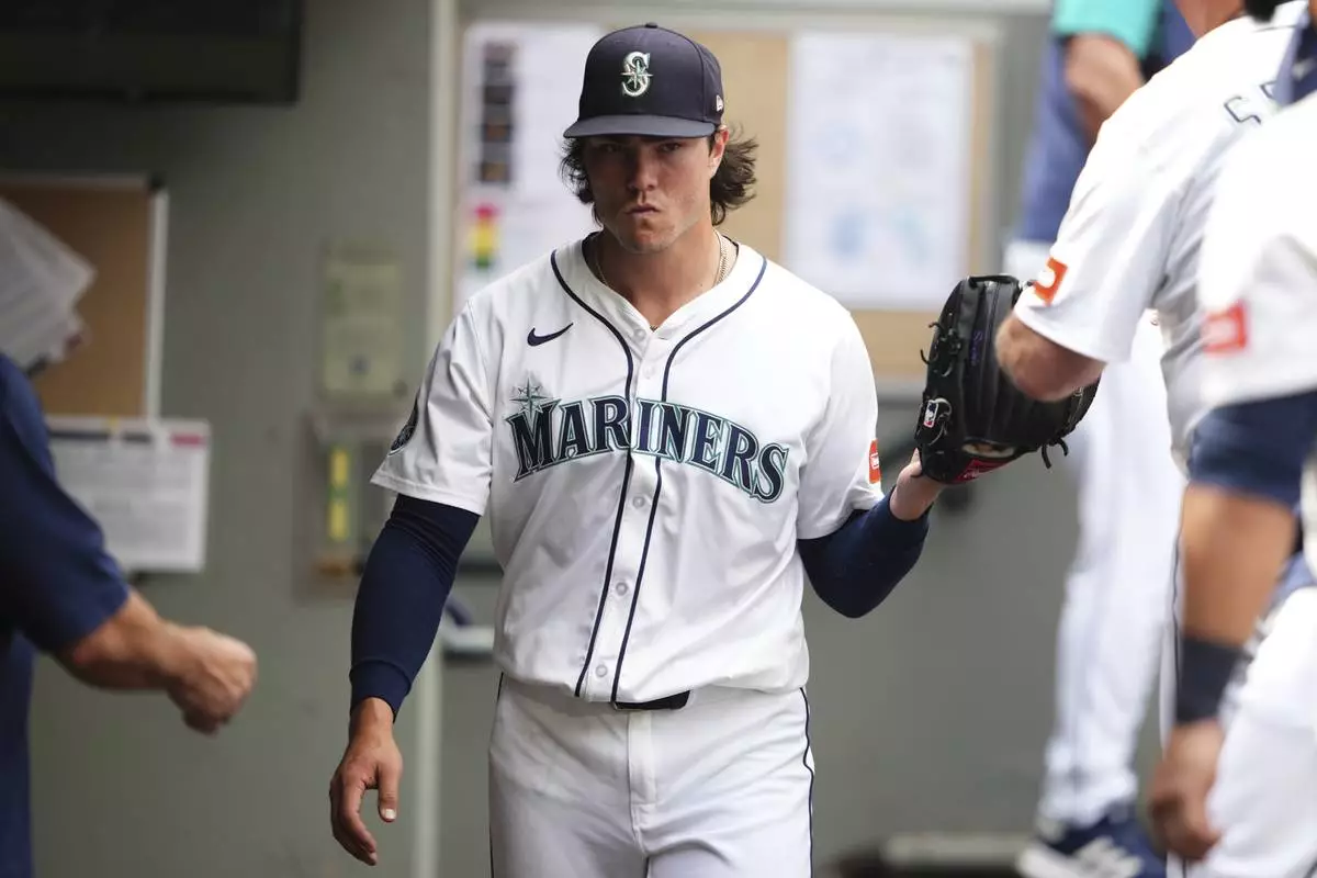 Seattle Mariners starting pitcher Bryan Woo reacts in the dugout after being relieved during the sixth inning of a baseball game against the San Diego Padres, Wednesday, Aug. 27, 2025, in Seattle. (AP Photo/Lindsey Wasson)