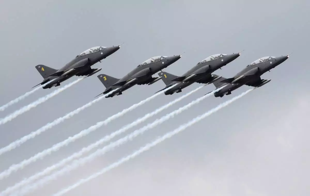 FILE - Finnish aerobatics group Midnight Hawks performs during a celebration marking the Russian air force's 100th anniversary in Zhukovsky, outside Moscow, Russia, on Aug. 11, 2012. (AP Photo/Misha Japaridze, File)