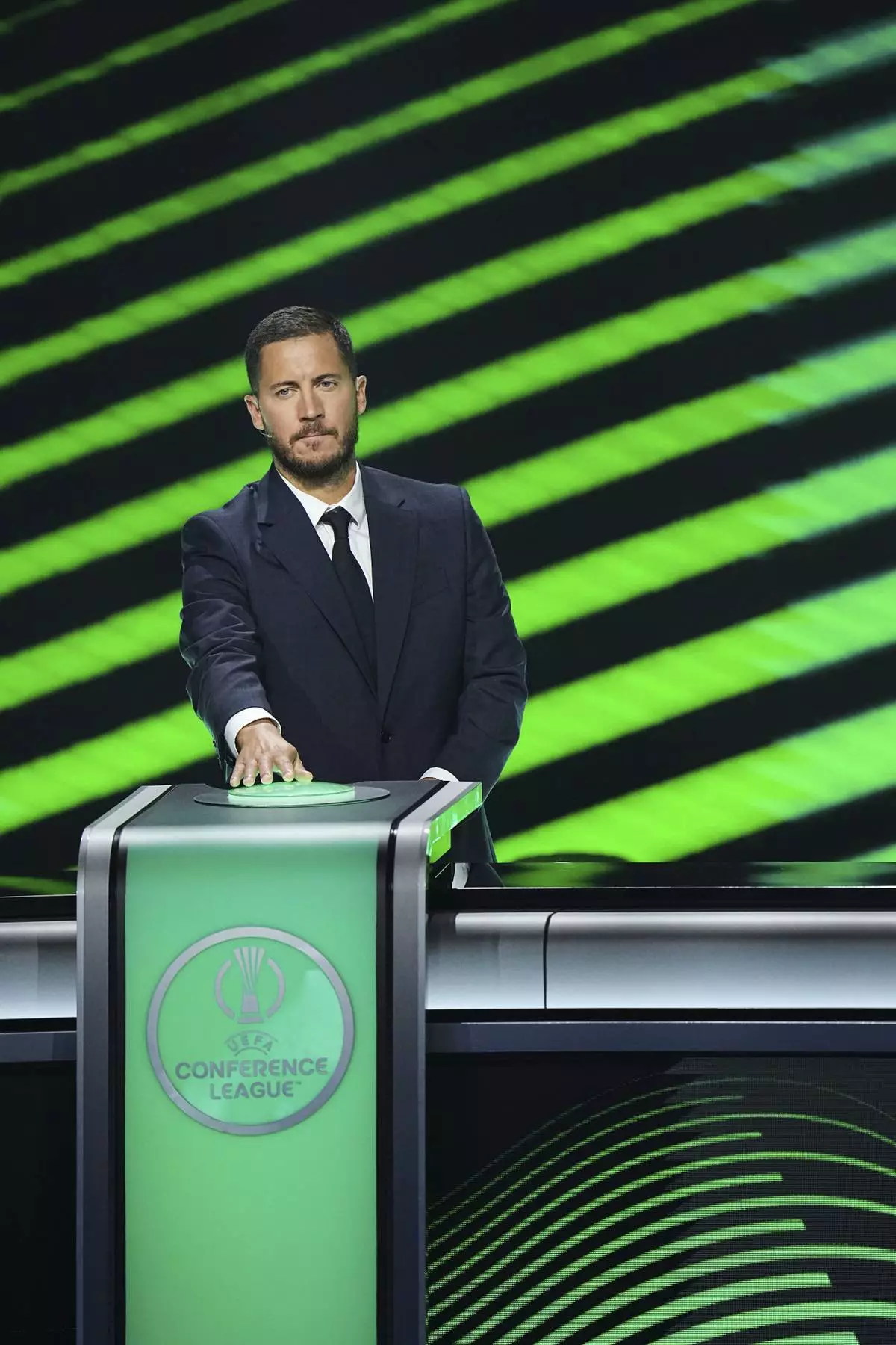 Former Belgium soccer player Eden Hazard pushes the button to initiate the automated draw for the teams during the Conference League soccer league phase draw in Monaco, Friday, Aug. 29, 2025. (AP Photo/Laurent Cipriani)