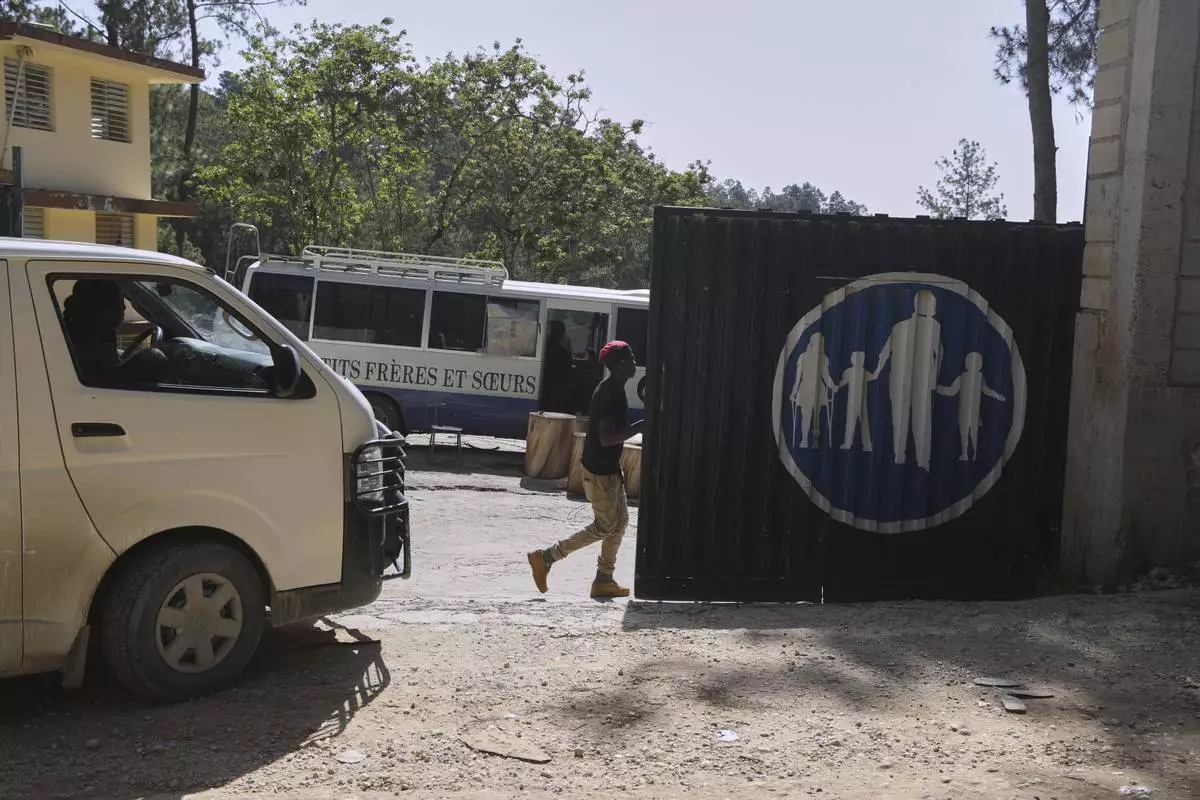 FILE - Workers enter the Saint-Helene orphanage in the Kenscoff neighborhood of Port-au-Prince, Haiti, Aug. 4, 2025, the day after gunmen stormed the property and kidnapped eight people. (AP Photo/Odelyn Joseph, File)