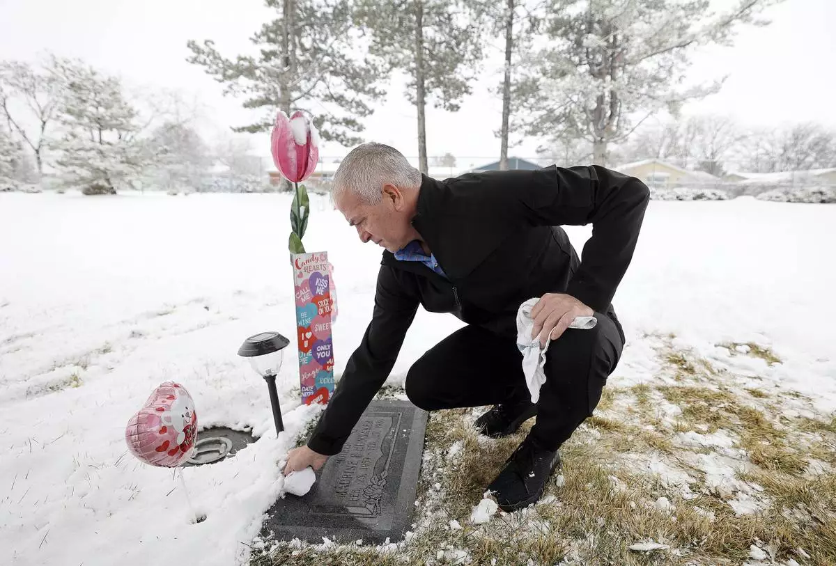 Matt Hunsaker cleans off the grave of his mother Maurine Hunsaker, who was murdered in 1986, at Valley View Memorial Park in West Valley City, Utah, on Friday, Feb. 9, 2024. (Kristin Murphy/The Deseret News via AP)