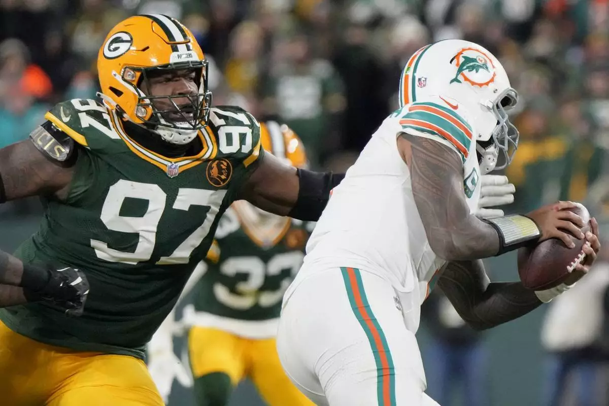 FILE - Green Bay Packers defensive tackle Kenny Clark (97) sacks Miami Dolphins quarterback Tua Tagovailoa during the second half of an NFL football game Thursday, Nov. 28, 2024, in Green Bay, Wis. (AP Photo/Morry Gash, File)