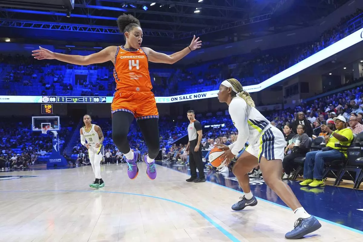 Connecticut Sun guard Bria Hartley (14) jumps to defend a shot by Dallas Wings forward Diamond Miller, right, during the second half of a WNBA basketball game in Arlington, Texas, Wednesday, Aug. 27, 2025. (AP Photo/LM Otero)