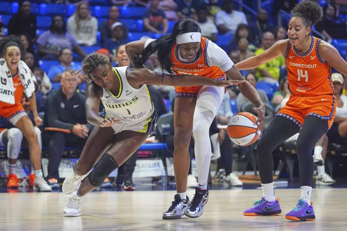 Dallas Wings forward Diamond Miller (1) reaches for the ball against Connecticut Sun forward Aneesah Morrow, center, and guard Bria Hartley (14) during the second half of a WNBA basketball game in Arlington, Texas, Wednesday, Aug. 27, 2025. (AP Photo/LM Otero)