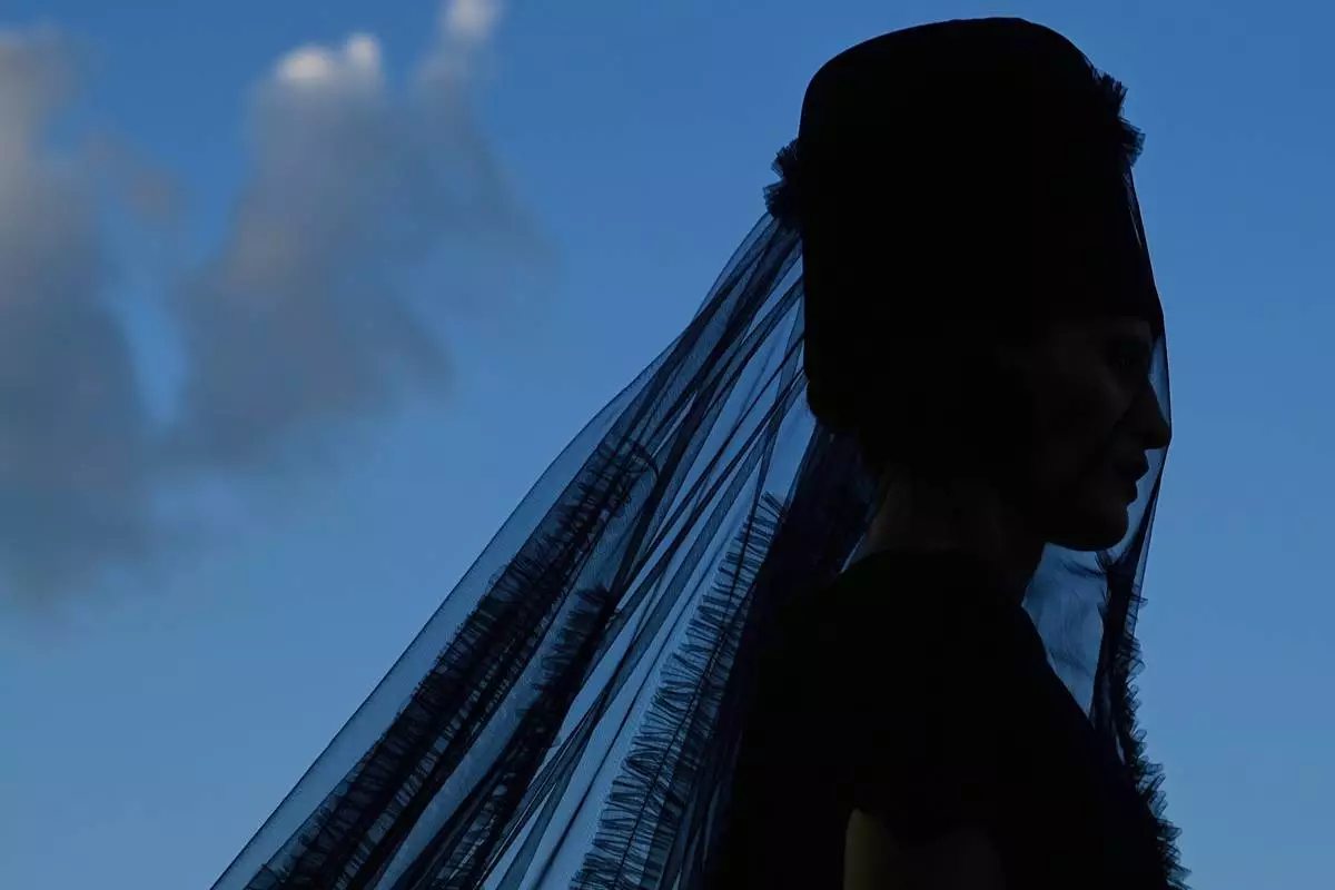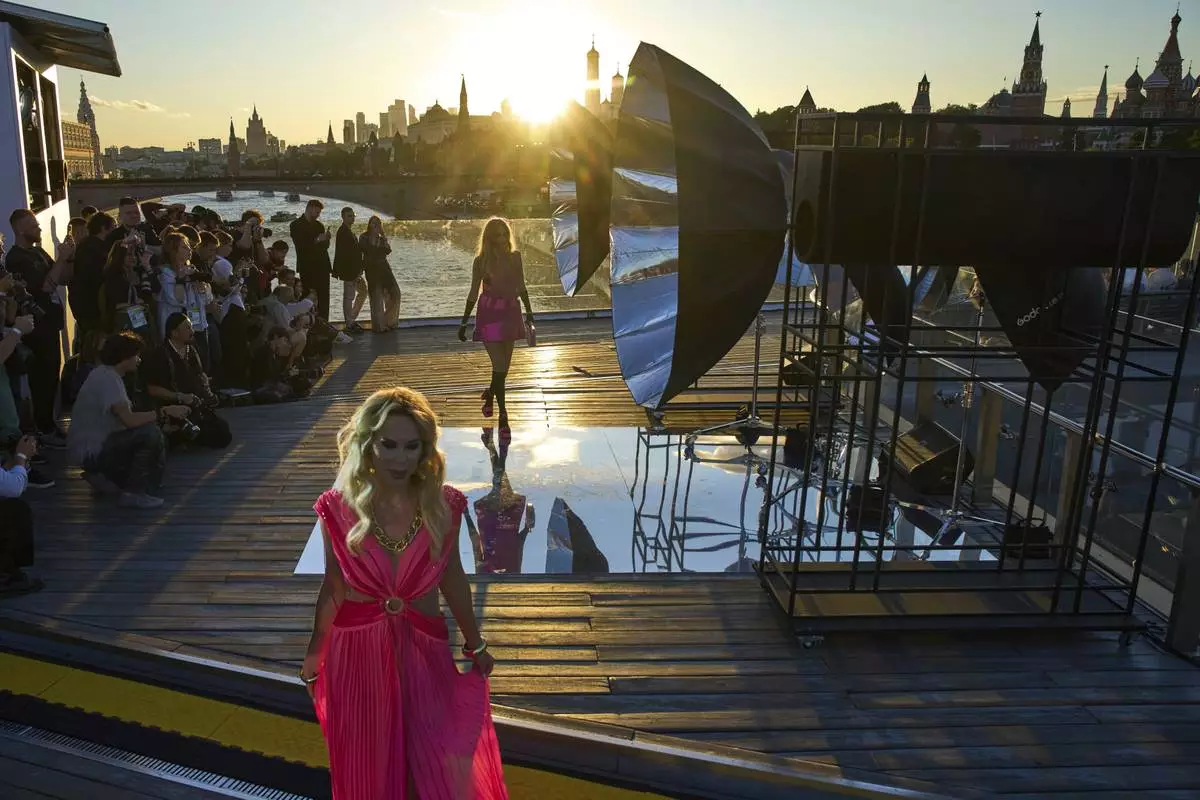 Model wear a creation by Russian designer Julia Dalakian on the Floating Bridge during sunset at Moscow Fashion Week at Zaryadye park in Moscow, Monday, Sept. 1, 2025, with the Kremlin in the background. (AP Photo/Alexander Zemlianichenko)