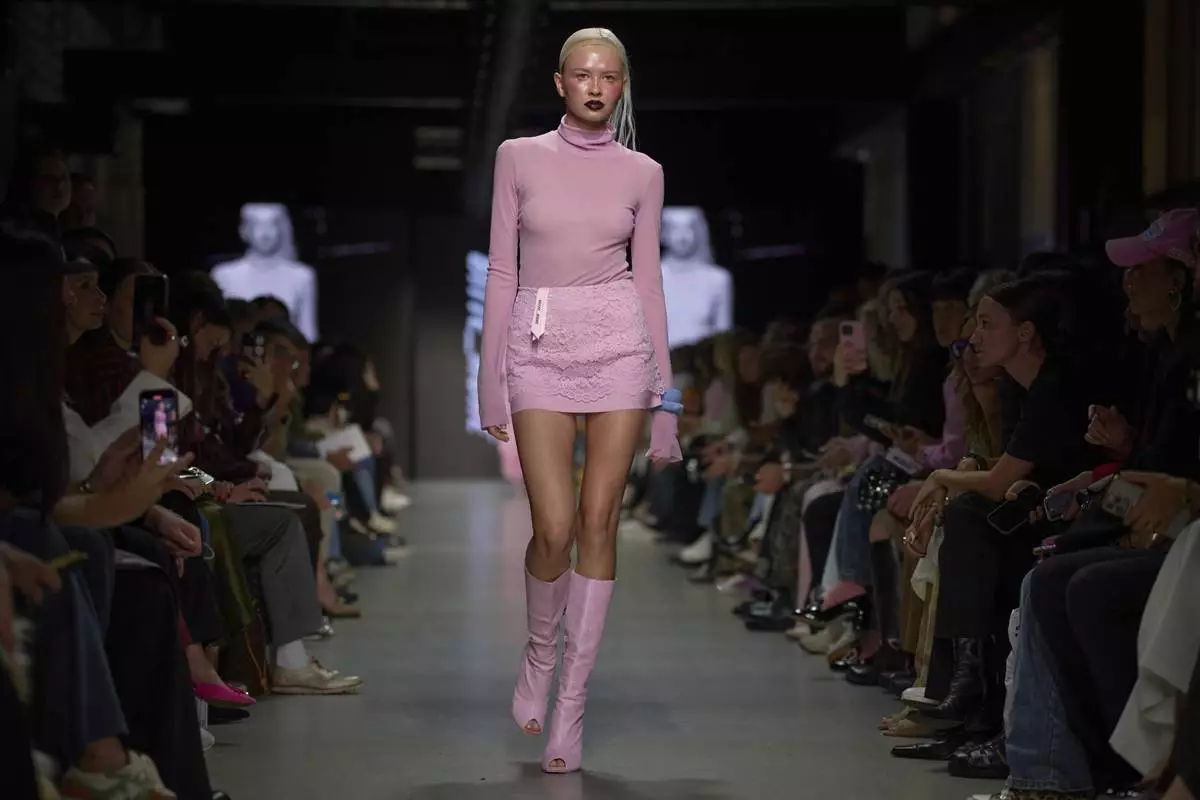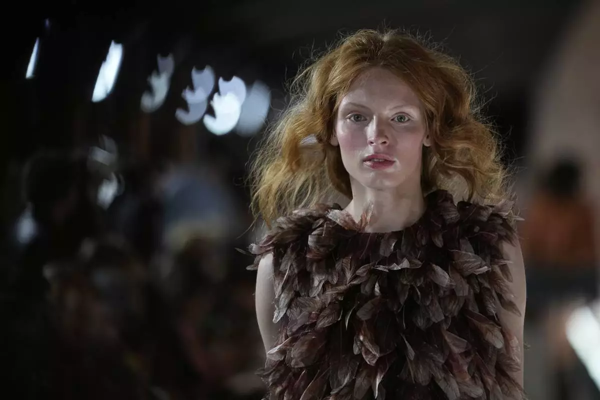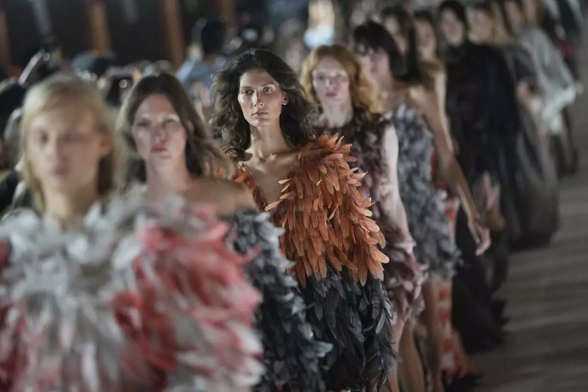 Model wear creations by Russian designer Alena Akhmadullina on a runway at Moscow Fashion Week in Moscow, Tuesday, Sept. 2, 2025. (AP Photo/Pavel Bednyakov)