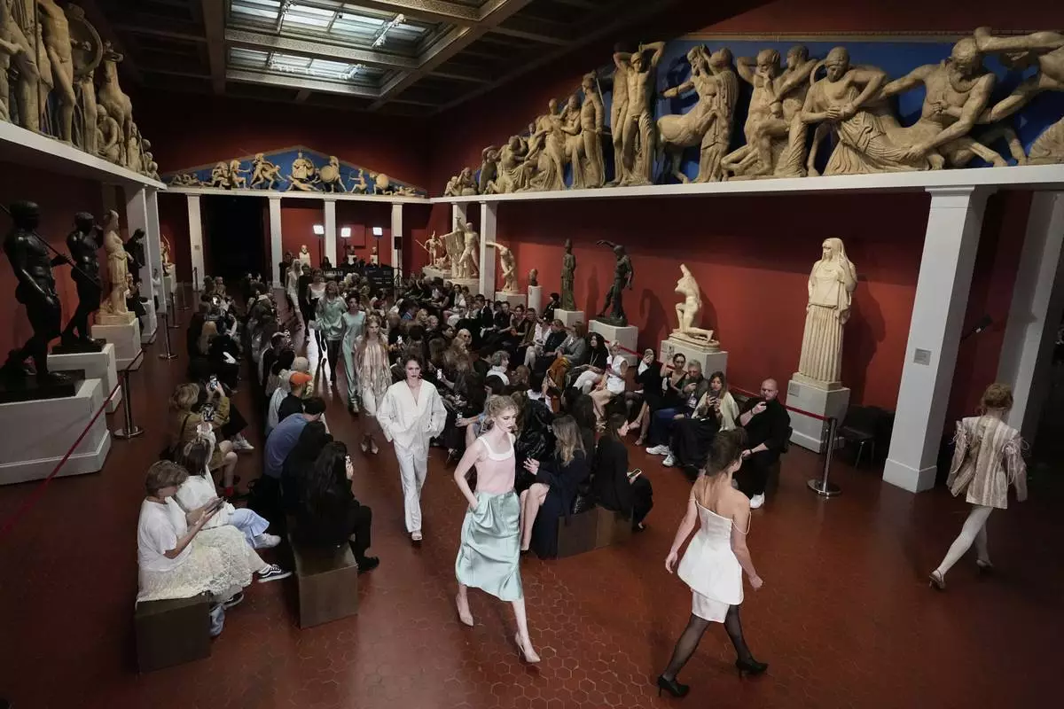 Models wear creations by Russian brand Soroka On Course on a runway at the ancient Greek art hall of the Pushkin State Museum of Fine Arts during the Moscow Fashion Week in Moscow, Russia, Monday, Sept. 1, 2025. (AP Photo/Pavel Bednyakov)