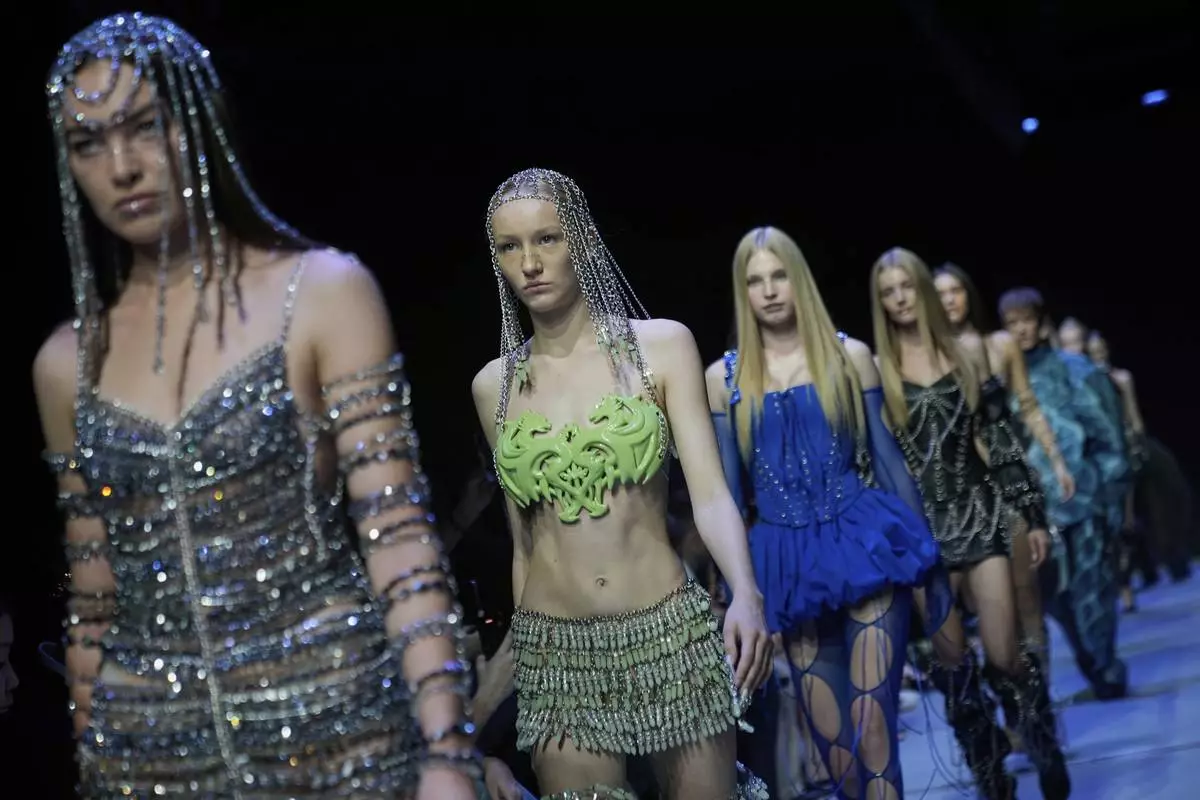 Models wear creations by Brazilian brand Artemisi on a runway at the Moscow Fashion Week in Moscow, Russia, Friday, Aug. 29, 2025. (AP Photo/Pavel Bednyakov)