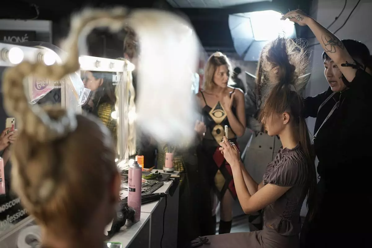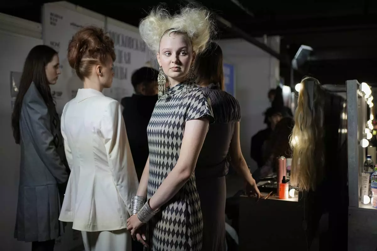 Models are prepared for a runway show at the backstage of the Moscow Fashion Week in Moscow, Russia, Friday, Aug. 29, 2025. (AP Photo/Pavel Bednyakov)