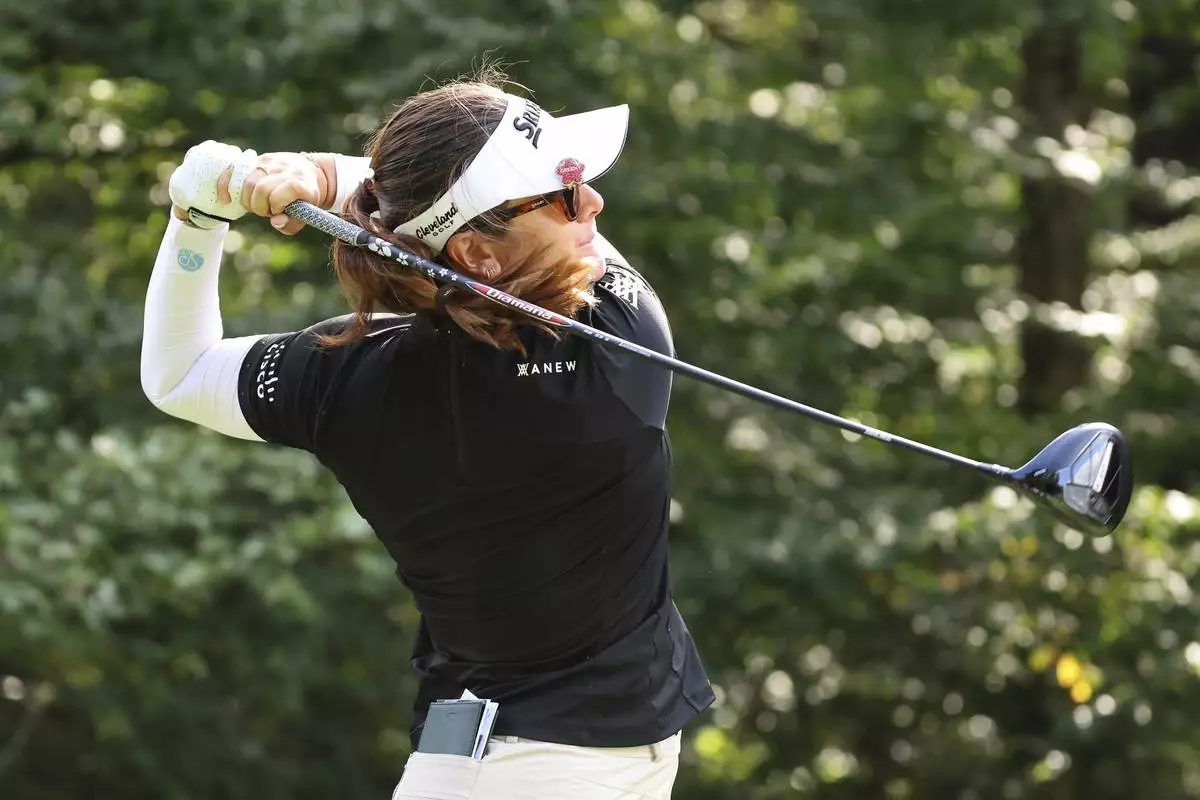 Hannah Green, of Australia, tees off on the ninth hole during the first round of the FM Championship LPGA golf tournament at TPC Boston, Thursday, Aug. 28, 2025, in Norton, Mass. (AP Photo/Michael Dwyer)
