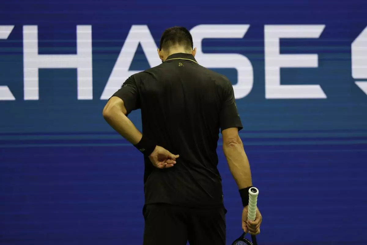 Novak Djokovic, of Serbia, holds his back against Cameron Norrie, of Great Britain, during the third round of the U.S . Open tennis championships, Friday, Aug. 29, 2025, in New York. (AP Photo/Adam Hunger)