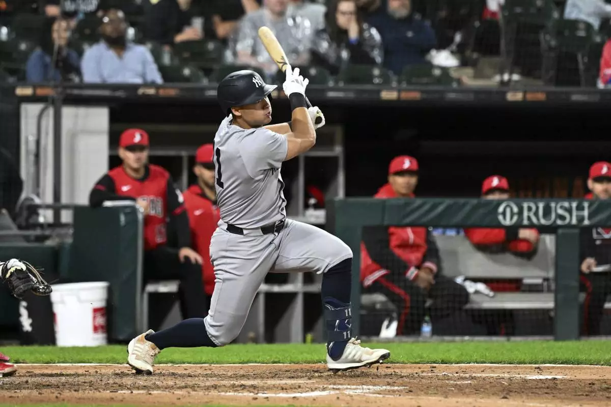 New York Yankees' Anthony Volpe hits an RBI single during the sixth inning of a baseball game against the Chicago White Sox, Friday, Aug. 29, 2025, in Chicago. (AP Photo/Matt Marton)