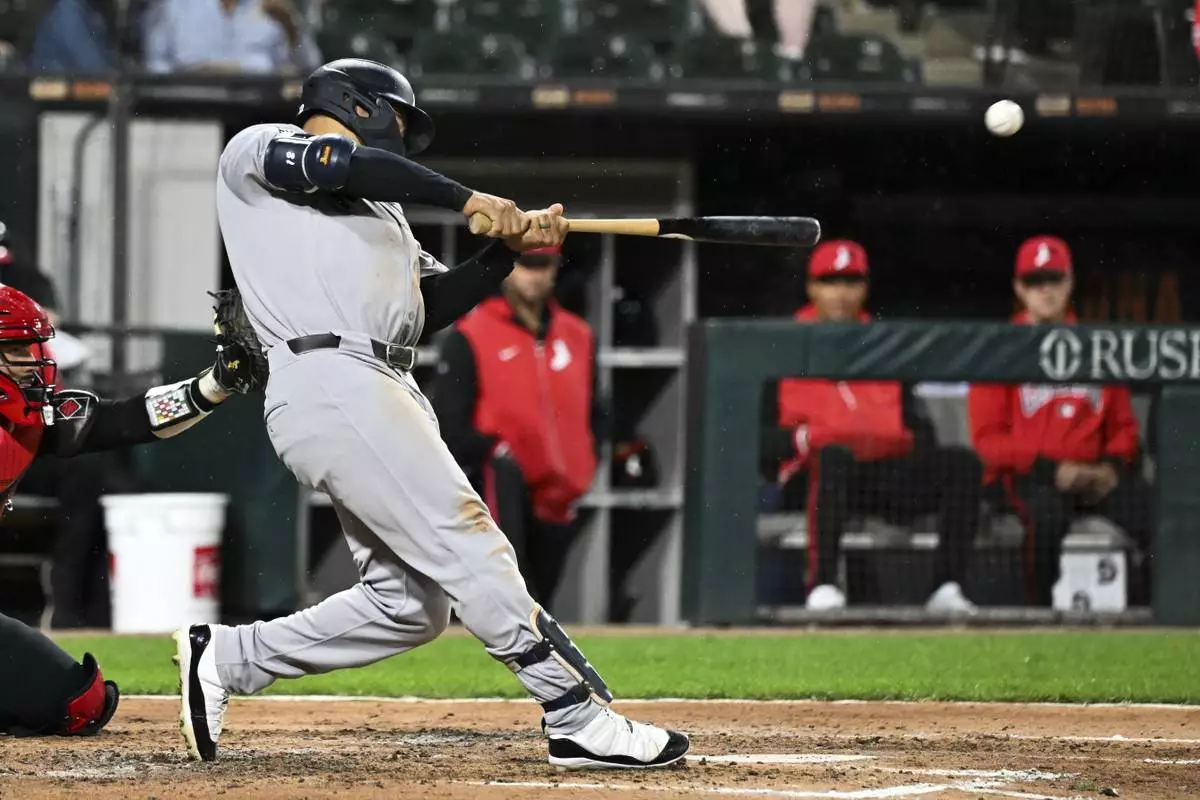 New York Yankees' Trent Grisham hits a grand slam during the fourth inning of a baseball game against the Chicago White Sox, Friday, Aug. 29, 2025, in Chicago. (AP Photo/Matt Marton)