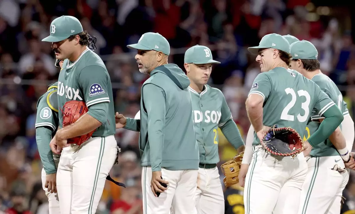 Boston Red Sox manager Alex Cora, center, takes out pitcher Payton Tolle, left, during the sixth inning of a baseball game against the Pittsburgh Pirates, Friday, Aug. 29, 2025, in Boston. (AP Photo/Mark Stockwell)