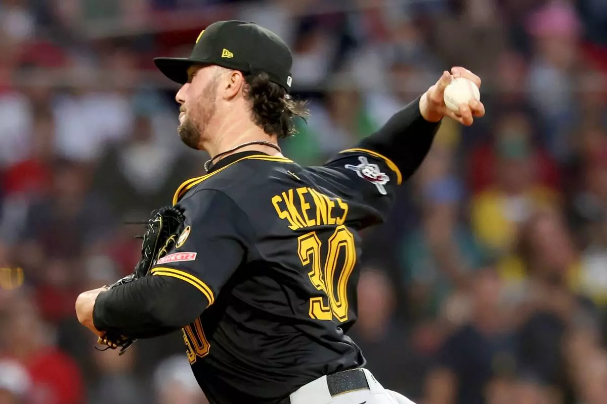 Pittsburgh Pirates pitcher Paul Skenes throws during the first inning of a baseball game against the Boston Red Sox, Friday, Aug. 29, 2025, in Boston. (AP Photo/Mark Stockwell)