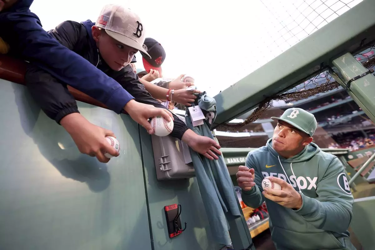 Boston Red Sox third baseman Nate Eaton, right, asks for a pen to sign a ball for a fan before a baseball game against the Pittsburgh Pirates, Friday, Aug. 29, 2025, in Boston. (AP Photo/Mark Stockwell)