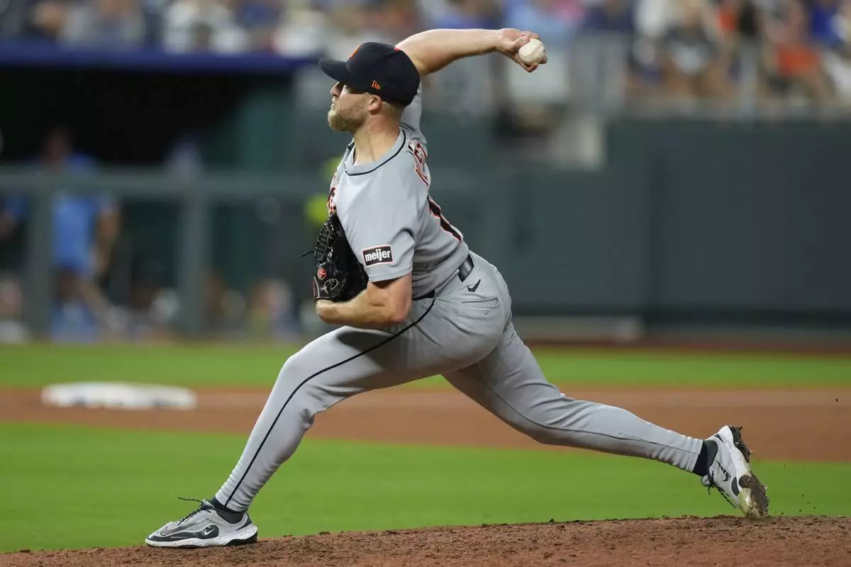 Detroit Tigers relief pitcher Will Vest throws during the ninth inning of a baseball game against the Kansas City Royals, Friday, Aug. 29, 2025, in Kansas City, Mo. (AP Photo/Charlie Riedel)