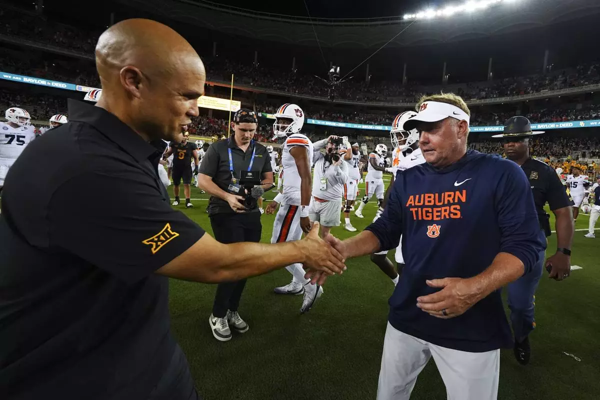 Baylor head coach Dave Aranda, left, shakes hands with Auburn head coach Hugh Freeze following an NCAA college football game Friday, Aug. 29, 2025, in Waco, Texas. (AP Photo/Julio Cortez)
